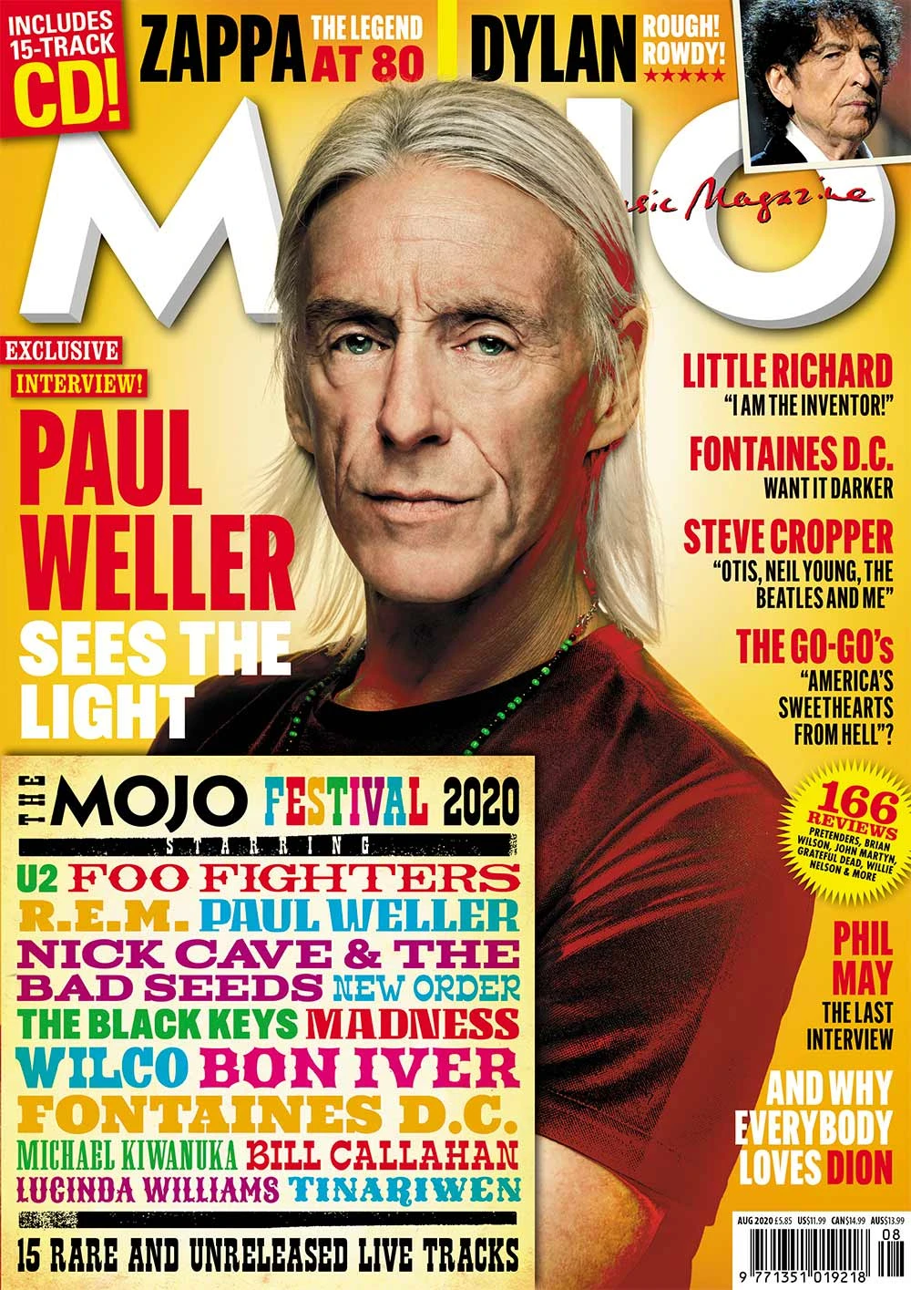 PAUL WELLER TRACES the music and themes that have illuminated his career, from The Jam to now, while delving into his soulful new album, On Sunset. Meanwhile, summer festival vibes pour forth from MOJO’s amazing covermount CD, with exclusive live tracks from Weller, Nick Cave, U2, R.E.M., The Black Keys, New Order, Foo Fighters, Michael Kiwanuka, Lucinda Williams and more. Also in the issue: Bob Dylan’s all-new album; Little Richard and the Big Bang of rock’n’roll; Frank Zappa – the legend at 80; Steve Cropper’s soul odyssey. Plus: The Go-Go’s, Fontaines DC, Dion, Cat Stevens, Shirley Collins, Robert Johnson, Pretenders, Blake Mills, Florian Schneider, Brian Wilson, Grateful Dead, the last interview with The Pretty Things’ Phil May, and… in lockdown with Glen Matlock and Earl Slick!